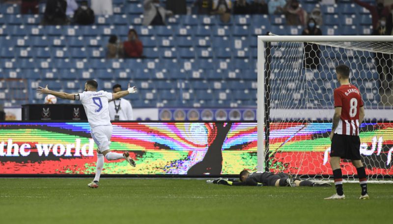 O veterano Luka Modric, aos 38 minutos, e Karim Benzema, aos 52, de penálti, marcaram os golos no Estádio King Fahd International, na Arábia Saudita, onde o líder da Liga espanhola se superiorizou ao atual nono classificado, que falharia um penálti nos minutos finais.